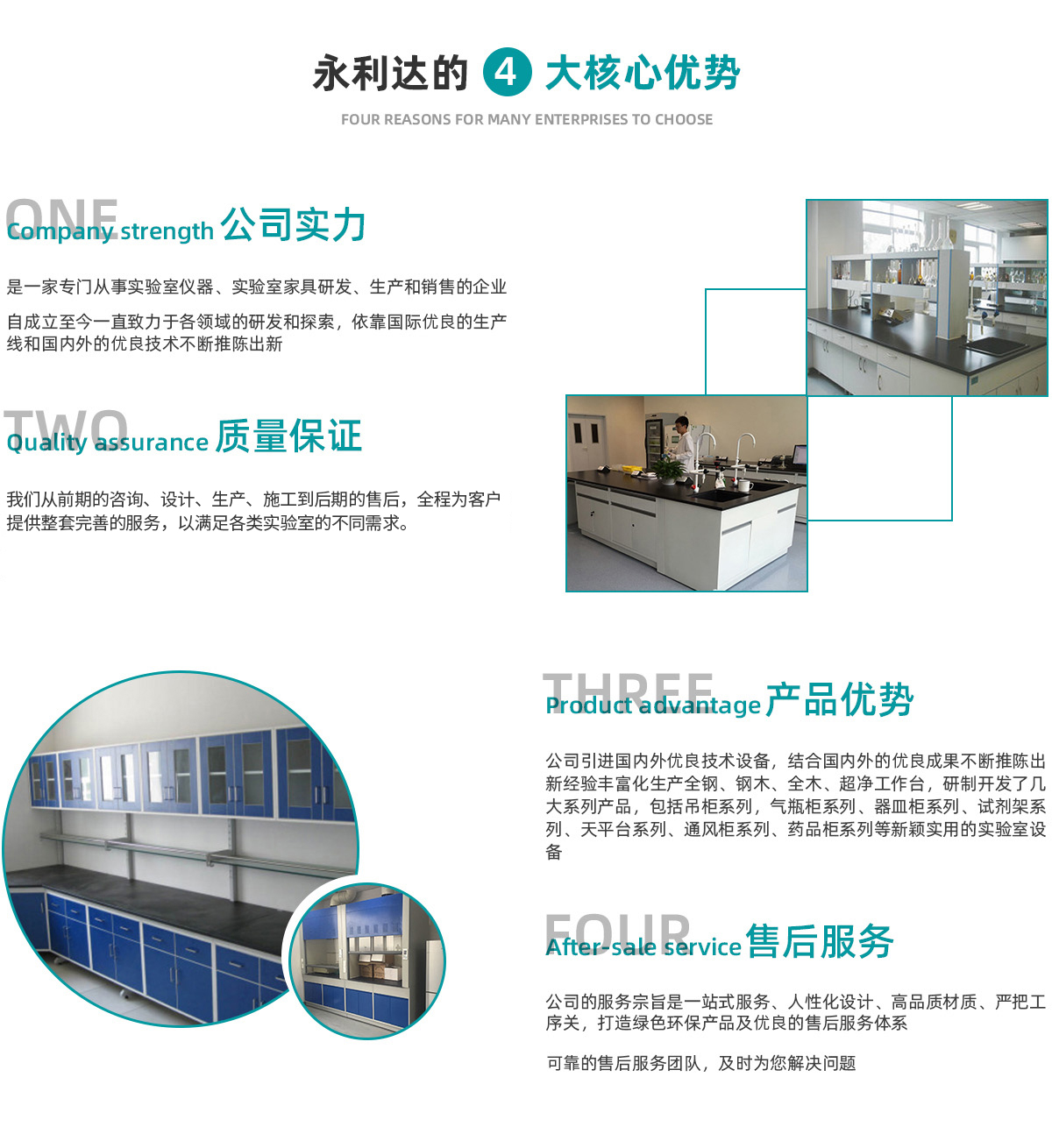 天津永利達(dá)實(shí)驗(yàn)室設(shè)備有限公司是一家從事實(shí)驗(yàn)室家具研發(fā)、生 產(chǎn)、銷售與服務(wù)于一體的企業(yè)。成立于2006年,坐落于天津市靜海高新產(chǎn)業(yè)園區(qū)。公司秉承“科技創(chuàng)新、質(zhì)量為本、服務(wù)至上”的理念,致力于為用戶提供實(shí)驗(yàn)室家具和整體解決方案。 公司的主要業(yè)務(wù)涵蓋了實(shí)驗(yàn)室家具、實(shí)驗(yàn)室通風(fēng)、凈化、集中供氣、純水及裝修等多個(gè)領(lǐng)域,憑借多年在實(shí)驗(yàn)室行業(yè)的積累,和不斷吸收國(guó)際上的技術(shù)與設(shè)計(jì)理念,我們從前期的咨詢、設(shè)計(jì)、生產(chǎn)、施工到后期的售后,全程為客戶提供整套完善的服務(wù),以滿足各類實(shí)驗(yàn)室的不同需求。 公司的服務(wù)宗旨是 提供人性化設(shè)計(jì)、材質(zhì)、嚴(yán)把工序關(guān),打造綠色環(huán)保產(chǎn)品及完善的售后服務(wù)體系。